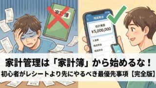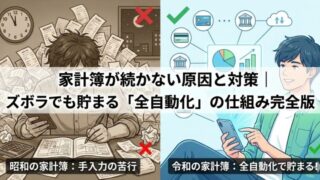 守る家計簿が続かない原因と対策|ズボラでも貯まる「全自動化」の仕組み完全版 家計簿が3日も続かないのは、あなたの意志が弱いからではありません。「仕組み」が間違っているだけです。レシート入力不要、計算不要。99%のムダを削ぎ落とし、勝手にお金が貯まる「自動化家計簿」の構築手順と、挫折しない運用ルールを徹底解説。 2026.01.07守る